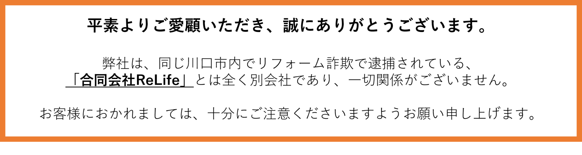 株式会社Re・LIFEは、「生活(LIFE)を見直し(Re)幸せな人生を送っていただく」ことをコンセプトに、地域密着でリフォーム業務を請け負います。お客様との信頼関係を大切にし、ご要望にしっかりと応えることをお約束いたします。
